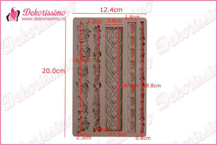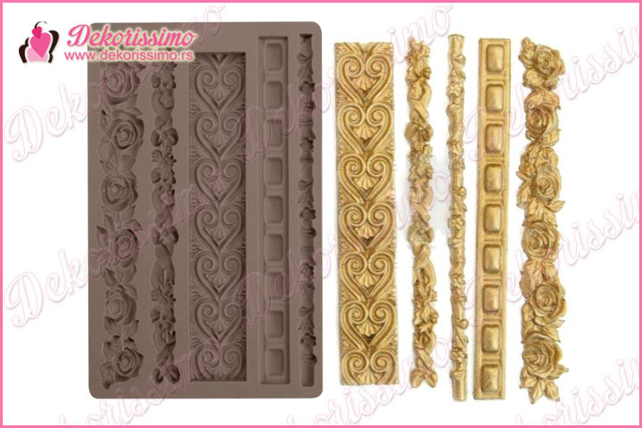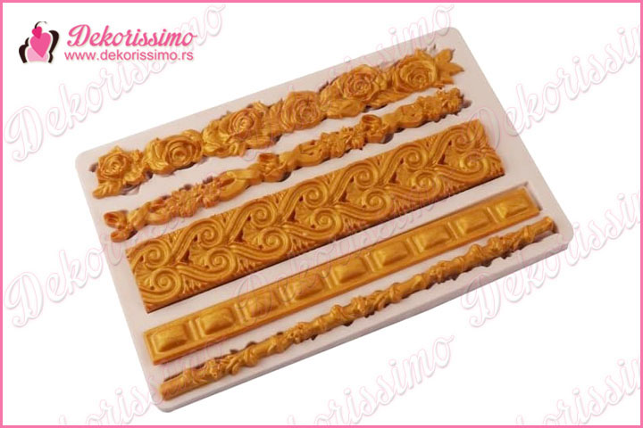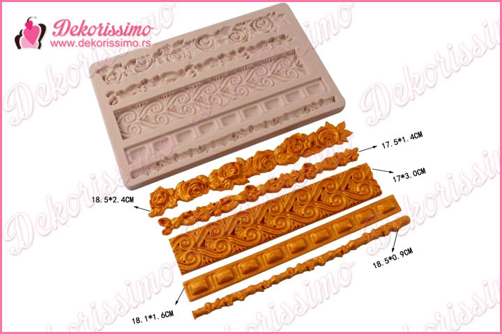 Kreirajte venčanu tortu, krštenje ili godišnjicu koja zrači luksuzom! Naša silikonska modla – K4413 sadrži 4 prefinjena dizajna bordura: srca, ruže, i barokne elemente. Ne morate biti majstor, modla sve radi za vas.